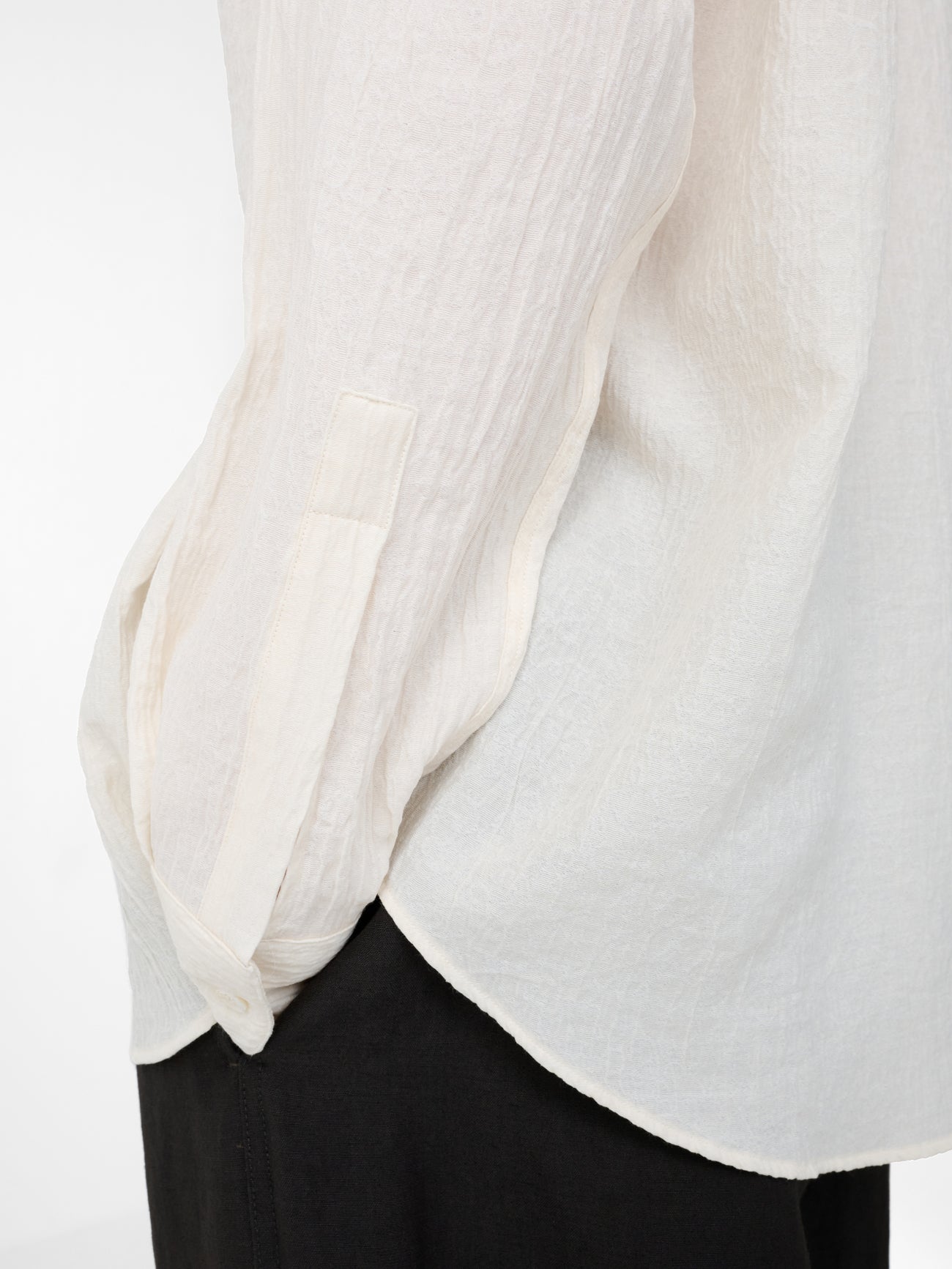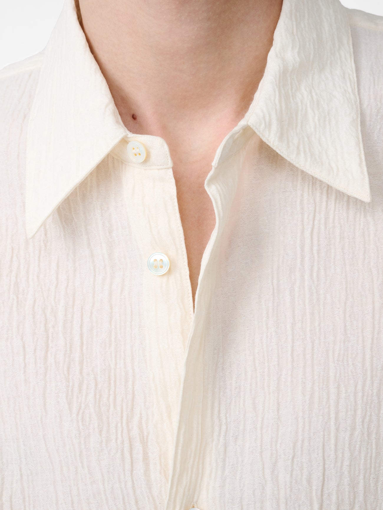 Cut from an Italian-milled minimal matelassé cloth that’s made with interlocking yarns, giving a delicate and textured hand feel, this season’s iteration of the View shirt is a playful revision of classic men’s shirt styles: tailored, but without the stiffness of a formal shirt. It has a generous, slightly boxy fit which stops short of being truly oversized. Its collar and cuffs have a soft construction, giving them a casual feel.