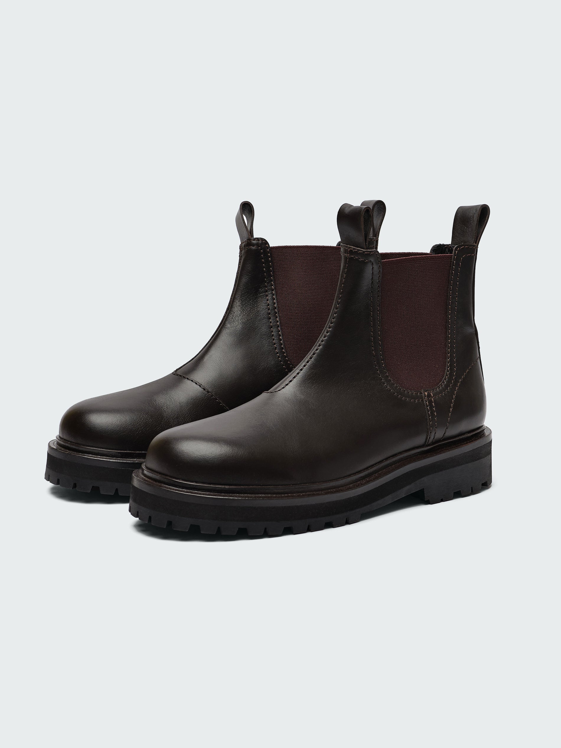 Kick blends industrial influences with nods to fine shoemaking. The upper is constructed from a highly refined Italian leather, which contrasts with the heavy duty twin-needle stitching and chunky Vibram lug sole.